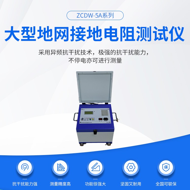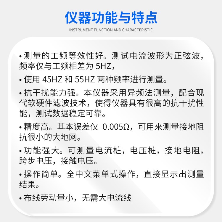 >异频抗干扰技术,能在强干扰环境下准确测得工频50Hz下的数据。测试电流5a,不会引起测试时接地装置的电位过高,同时它还具有极强的抗干扰能力,故可以在不停电的情况下进行测量。