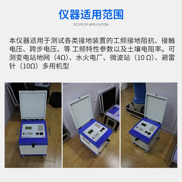 适用于测试各类接地装置的工频接地阻抗、接触电压、跨步电压、等工频特性参数以及土壤电阻率。可测变电站地网(4Ω)、水火电厂、微波站(10Ω)、避雷针(10Ω)多用机型。