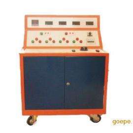 2.1以上准备工作完成后,按一下“三相交流电流”单元的“合闸”按钮,指示灯红灯亮,该回路接通,再按一下下面板“输出调节”单元的“合闸”按钮,红灯亮,调压器受电,顺时针调节“输出调节”三相调压器手柄,同时观察“三相交流电流”的电流表,直至所需电流值;旋转“三相交流电流”转换开关可分别读三相电流,意注转换开关在任何时候不应置于“0”位置;0-10A三相交流电流输出时,还要合上后接线板上“三相交流0-10A”接线柱旁边的空气开关。测试完成后,逆时针旋转三相调压器手柄至电压为零,分别按下“分闸”按钮;测试即告完成。