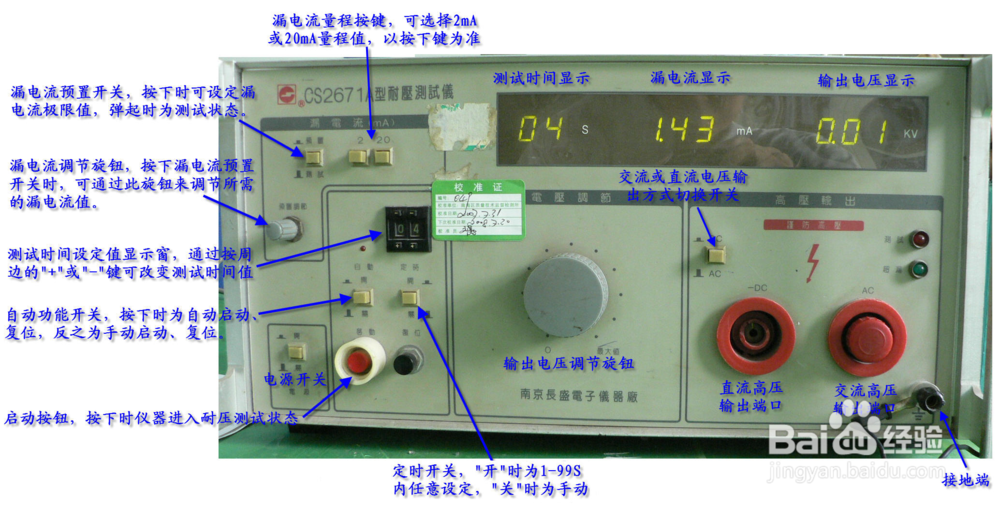 (3)转动漏电流调节旋钮,同时观看仪器显示屏上的漏电流值,选择测试方式,如果是手动测试则把定时开关设置为“关”;如果是定时测试则把定时开关设置为“开”,且要通过按动测试时间设定显示窗旁边的“+”或“-”号键,改变测试时间值,使其达到所需设定值。选择输出电压方式,如果要输出直流电压则按下DC/AC切换开关,反之则为交流输出电压方式。测试前仪器点检:将输出电压调至所需测试电压,然后将高压输出端夹具与接地端夹具短接,仪器发出报警声,仪器正常,否则,暂停使用,上报维修。按下启动按钮,此时测试灯亮,缓慢地转动输出电压调节旋钮,同时观看仪器显示屏上的电压值,使电压达到所需值,在此过程中如果仪器发出报警声,且超漏指示灯亮,说明此被测物不合格;如果无报警声、超漏指示灯也不亮,则为合格。测试结束,切断输出电压,如果是手动测试方式则将电压减小到测试电压值的一半时再按复位键切断;如果是定时测试方式则定时时间到时仪器自动切断输出电压。2.此仪器的测试过程均有高压,因此在测试过程中必须配戴绝缘橡皮手套,脚下垫绝缘橡皮垫,以防高压电击造成生命危险。
