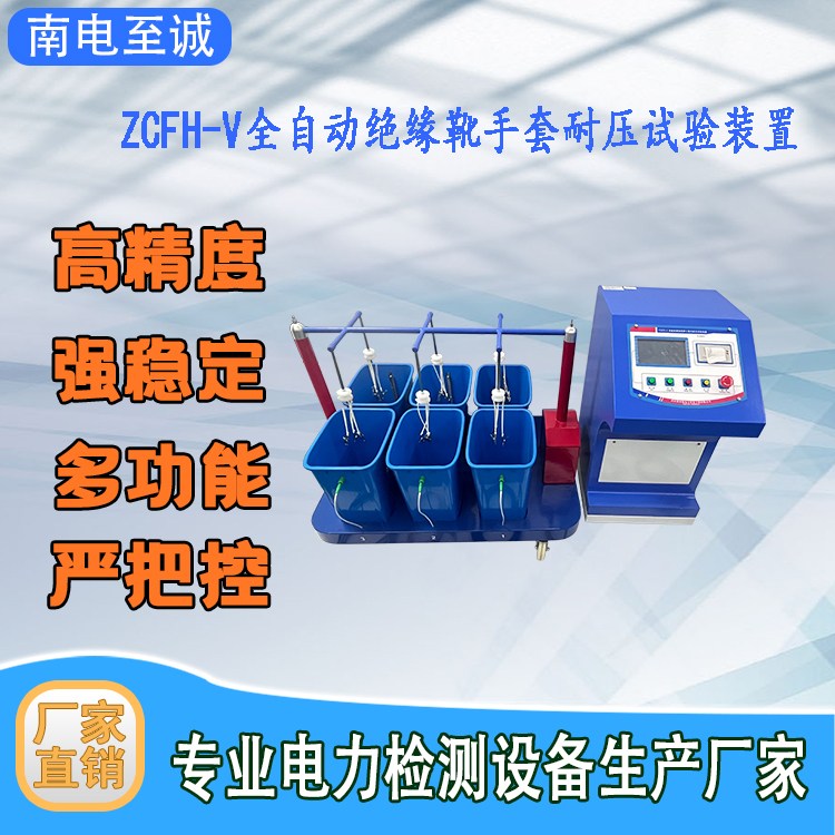 ZCFH-V全自动绝缘靴(手套)耐压试验装置是我公司根据绝缘靴(手套)的试验规程,并遵从广大用户意见而自行研发生产的。该产品采用全自动升(降)压,自动读出每个被试品的泄漏电流,整个过程全自动完成,自动打印试验数据,有效的解决了过去不规则的测试方式,从而简化了测试手续,提高了测试速度。更可靠地鉴别绝缘靴(手套)的泄漏电流,工频耐压等参数。保障了试验工作者的安全,是理想的绝缘靴(手套)专用设备。其主要特点:可同时测试3双绝缘靴(手套),并可读取每只的泄漏电流,准确判断不合格的绝缘靴(手套);结构底部装配脚轮,可随意移动。若选配相关辅助测试夹具,可用于绝缘操作杆,绝缘毯、绝缘垫、绝缘袖套、绝缘服、绝缘帽、绝缘梯、绝缘挡板、绝缘凳等绝缘工具的耐压试验。