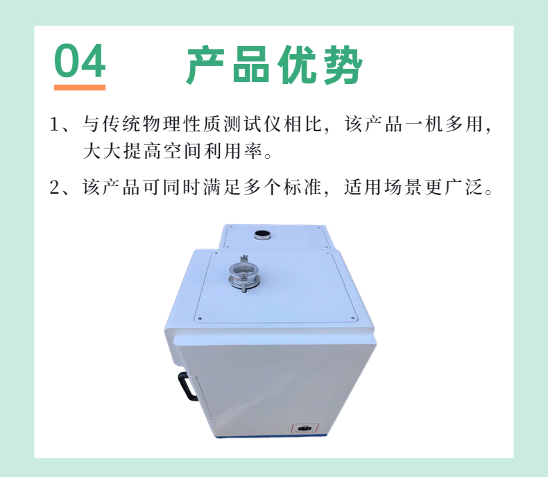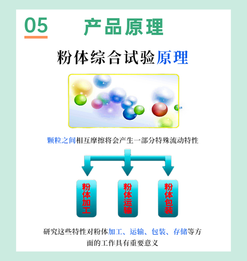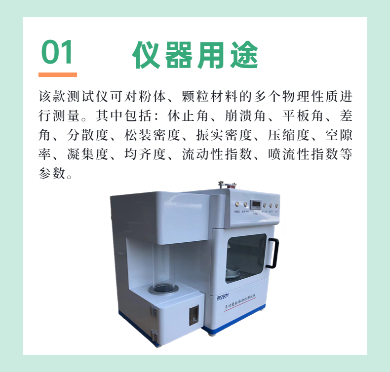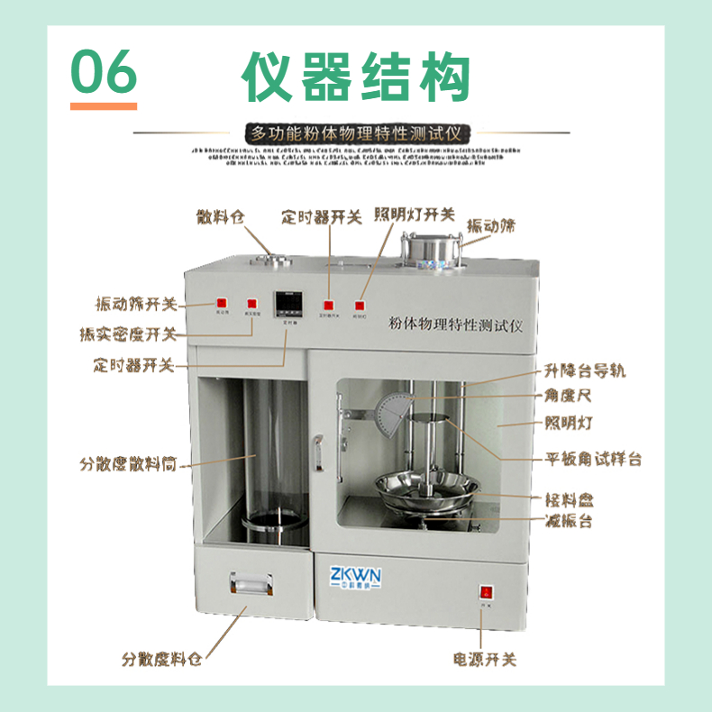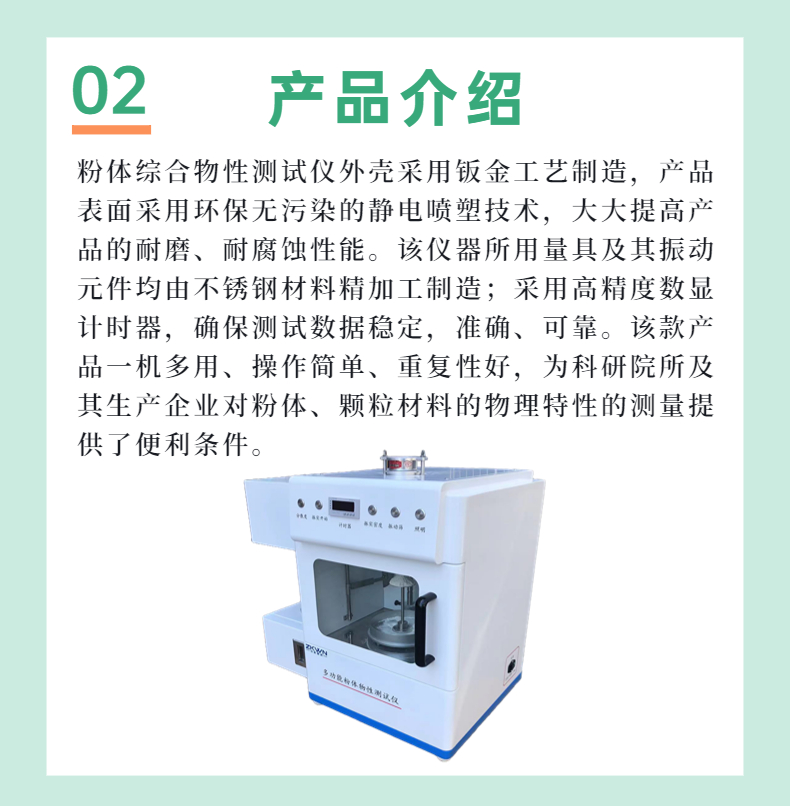 粉体综合物性测试仪外壳采用钣金工艺制造,产品表面采用环保无污染的静电喷塑技术,大大提高产品的耐磨、耐腐蚀性能。该仪器所用量具及其振动元件均由不锈钢材料精加工制造;采用高精度数显计时器,确保测试数据稳定,准确、可靠。该款产品一机多用、操作简单、重复性好,为科研院所及其生产企业对粉体、颗粒材料的物理特性的测量提供了便利条件。
