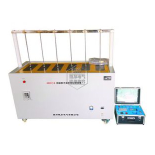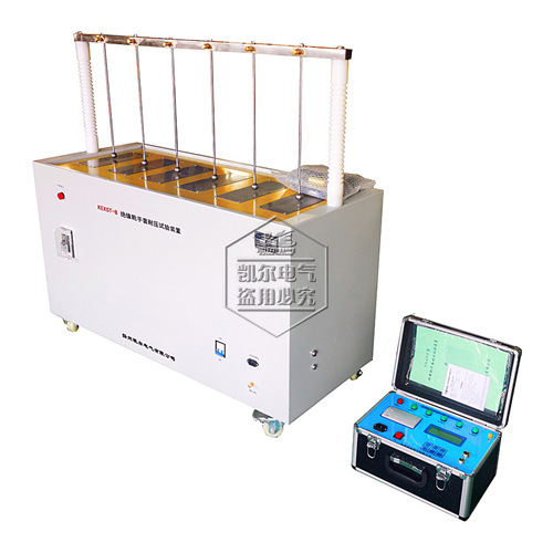 KEXST-B型本设备使用时,多6个试件放置于不锈钢专用容器中,由电动调压器和高压试验变压器产生的0~30KV的高压作为正极施加于试件上,根据预先设定的测试电压对实际电压进行调节,使测试电压和实际电压相同。这时将一路电压信号和多达6路电流信号通过远程通讯电缆传送至数据处理装置,数据处理装置对信号进行采集,放大及转换,并对电压信号与额定电压进行比较,根据不同情况,启动降压与升压继电器,同时它还监测六路电流的大小,如果六路电流中任一路的泄漏电流超过额定电流,则微电脑启动故障继电器对应回路的指示灯亮,高压测量装置也发出声光报警。如果六路电流都正常,则试验时间结束后,测试电压降至零,可能要求打印出测试报告。