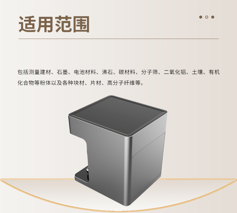 1. 适用产品多:包括测量建材、石墨、电池材料、沸石、碳材料、分子筛、二氧化铝、土壤、有机化合物等粉体以及各种块材、片材、高分子纤维等。