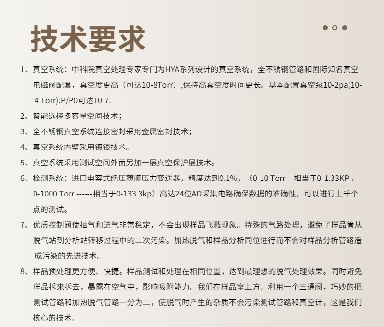 1. 真空系统:中科院真空处理专家专门为HYA系列设计的真空系统,全不锈钢管路和国际知名真空电磁阀配套,真空度更高(可达10-8Torr),保持高真空度时间更长。基本配置真空泵10-2pa(10-4 Torr).P/P0可达10-7.