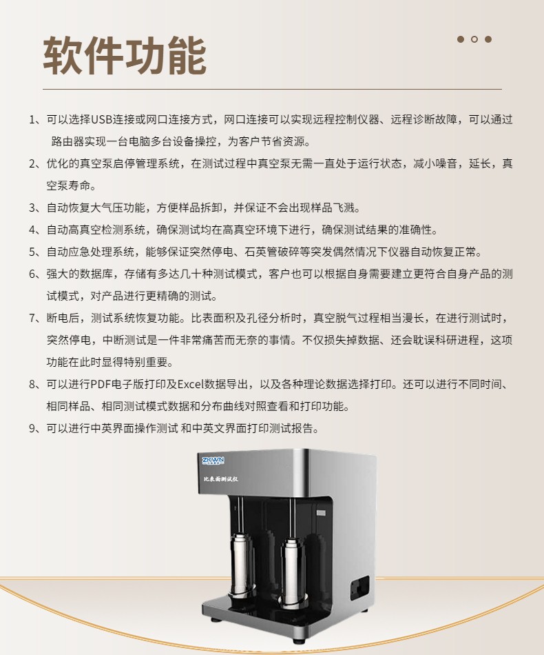 12. 分析范围广:比表面积0.0005m2/g(Kr测量)至无上限。孔径分析0.35nm-500nm。孔体积最小检测: 0.0001 cc/g。(氮气吸附,可加配备高真空系统).测试精度可达重复性误差〈±1%。