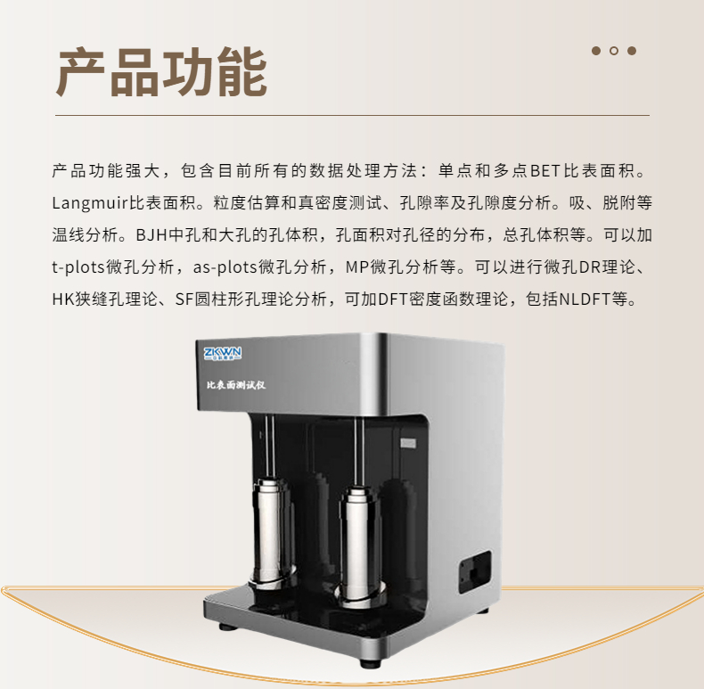 2. 功能强大,包含目前所有的数据处理方法:单点和多点BET比表面积。Langmuir比表面积。粒度估算和真密度测试、孔隙率及孔隙度分析。吸、脱附等温线分析。BJH中孔和大孔的孔体积,孔面积对孔径的分布,总孔体积等。可以加t-plots微孔分析,as-plots微孔分析,MP微孔分析等。可以进行微孔DR理论、HK狭缝孔理论、SF圆柱形孔理论分析,可加DFT密度函数理论,包括NLDFT等。