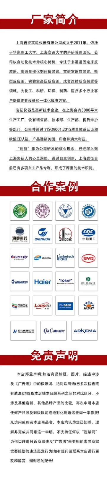 2 、其余部分设计 1) 所有罐的安装位置离地面有一定的高度,方便操作人员加料放料或排空; 2) 不同物料阀门及管道配备不同颜色的标签,一目了然,方便区分和操作; 3) 设备布局合理规范整齐,符合工艺流程走向的同时,方便操作和维护; 4) 所有管道安装整齐,位置合理,zui大限度的减少积液残留; 5) 设置低点放空,保证反应结束后装置内无物料残留; 6) 所有需要操作的设备和仪器都设计在操作人员方便的高度和范围以内;所有压力表都在操作人员可视的高度和范围以内; 7) 所有工艺部分的器件固定均采用可拆卸的,不采用焊接在框架上的方式,方便装置的未来升级扩充; 8) 装置的精密部件配置相应的保护措施,如反应器配备指针压力表及压力传感器,气体质量流量计前配备过滤器等保护措施; 9) 装置采用铝型材,结构稳固,组合简单,便于方便移动; 10) 装置整体工艺部分按照用户空间尺寸设计,置于中试车间,控制系统置于旁边,便于操作。