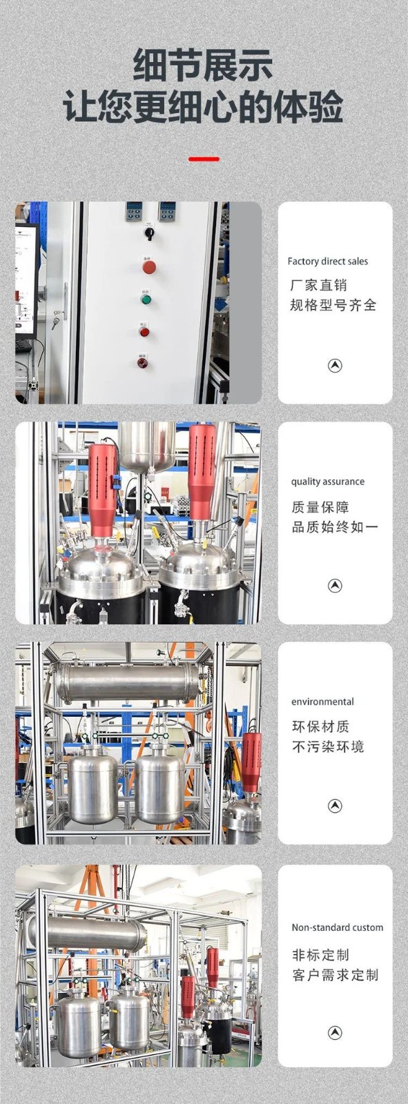 1 、反应釜均采用夹套保温,反应釜搅拌桨桨叶可手动拆卸更换。
